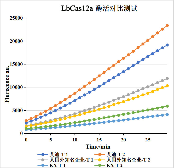反应体系中添加待检Target模板、Cas酶、crRNA和荧光探针,当crRNA与Cas酶组装成功能复合物并识别Target模板后,会激活Cas酶的反式切割活性并切割荧光探针释放出荧光信号,顺利获得荧光值来反映酶的性能。左图和右图是分别针对Lbucas12a和Lwacas3a两种酶进行测试,结果显示,球盟会生物基因给予的酶的荧光强度更强,切割活性与灵敏性明显更优。